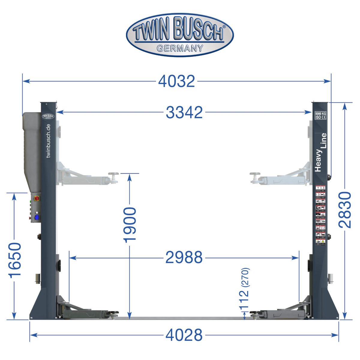 Med en løftekapasitet på 5,0 tonn og symmetrisk teleskoperende dobbeltleddede støttearmer, er TW250W-G vår kraftigste maskin i 2-søyle-serien.